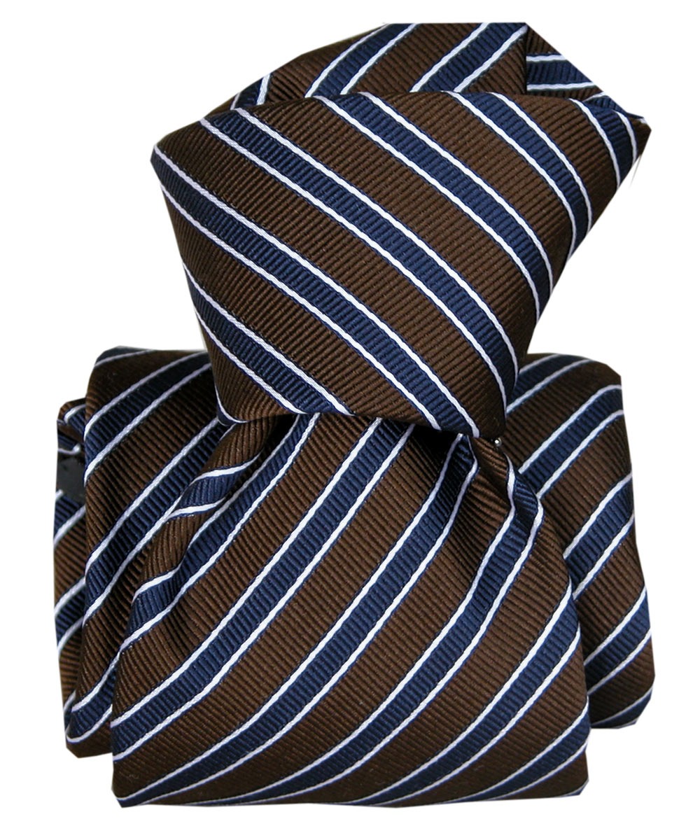 Silk twill jacquard tie with a diagonal regimental pattern, featuring a deep brown background interspersed with navy blue stripes and subtle white accents. The color contrast is subtle and sophisticated, ideal for understated yet commanding everyday elegance. The compact weave provides structure, definition, and a dry feel, perfect for business and classic tailoring.