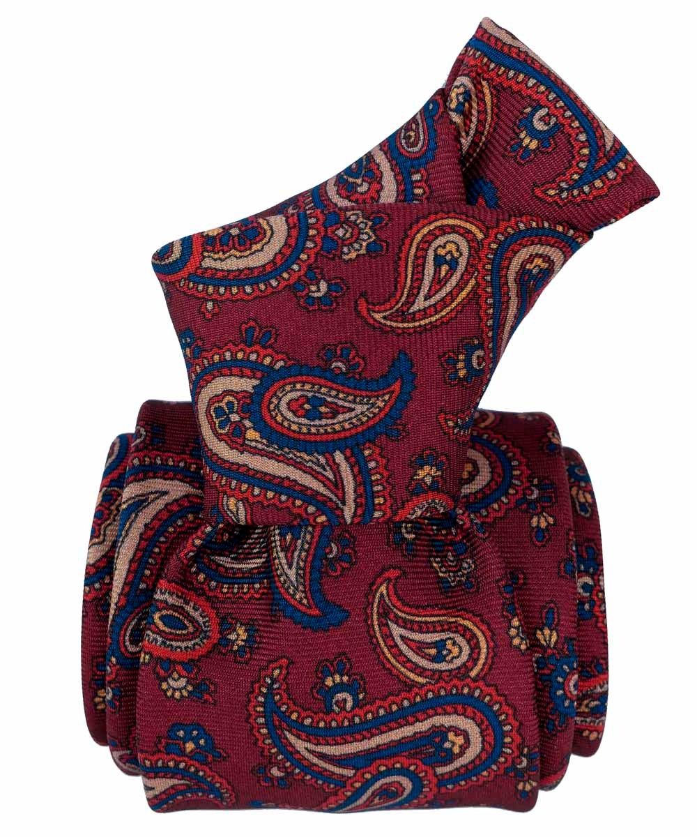 The deep burgundy base is enriched with a timeless paisley pattern, reinterpreted with contemporary flair through refined blue accents and beige details. The result is a harmonious composition that blends tradition with modern sophistication, making this tie a distinctive accessory for both formal and business attire.