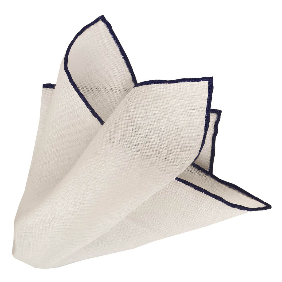 Pure linen pocket square featuring a natural texture and a lightweight yet structured hand feel. The navy contrast border and hand-rolled hem highlight its artisanal craftsmanship, adding understated elegance. Ideal for business and formal tailoring, it refines the outfit with subtle sophistication.